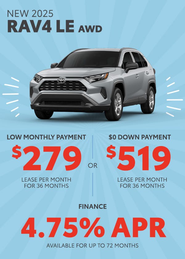 Finance: 4.75% APR available on select new 2025 Toyota Rav4 LE models for up to 72 months ($15.99 per $1,000 financed). On approved credit to qualified buyers.