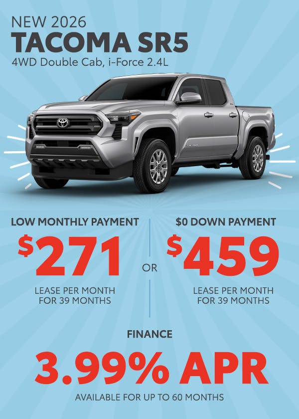 Finance: 3.99% APR available on select new 2026 Toyota Tacoma SR5 models for up to 60 months ($18.41 per $1,000 financed). On approved credit to qualified buyers.