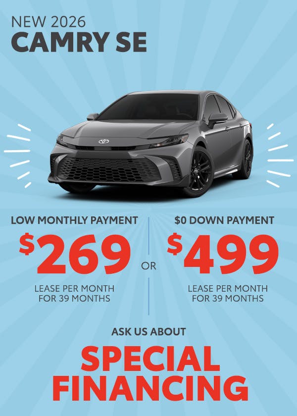 Low Lease: *With approved credit from Toyota Financial Services. 39 MONTH LEASE: $269 per month with $5,457 due at signing ($269 first payment + $0 security deposit + $3,999 down payment + $650 bank fee + $539 doc fee) Residual: $23,002. Tax, tags & title not included in lease offer. Customer responsible for maintenance, excess wear and tear and $0.15/mile over 10,000 miles per year per lease offer.