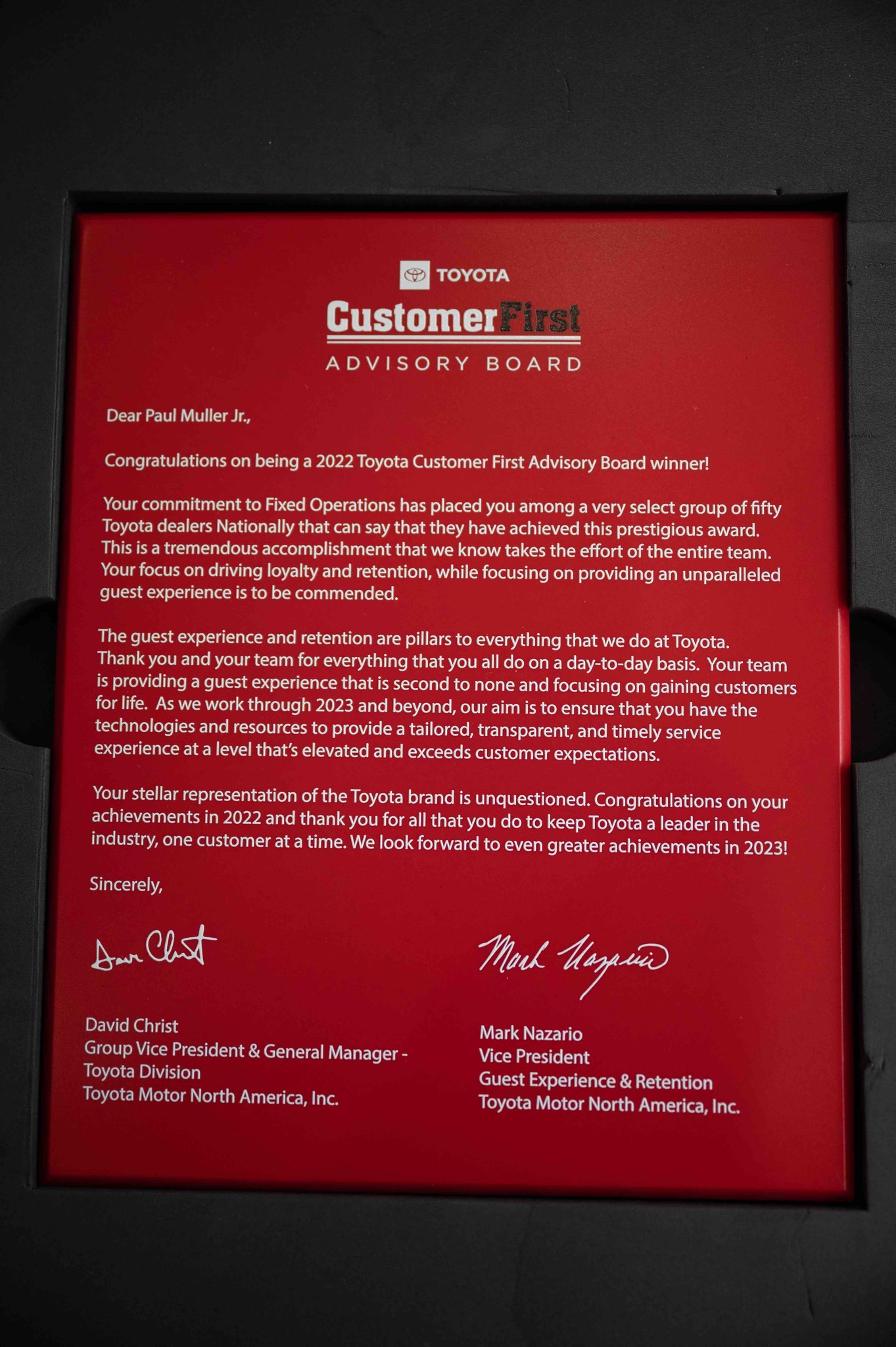 Team Toyota of Princeton is honored to receive Toyota’s Customer First Advisory Board Award! This award is based on the dealer’s achievement in Customer Satisfaction, representing the Top 50 dealers nationwide in Parts and Service. Thank you to everyone who helped us achieve this amazing award, and thank you to all our customers for being a part of our TEAM!